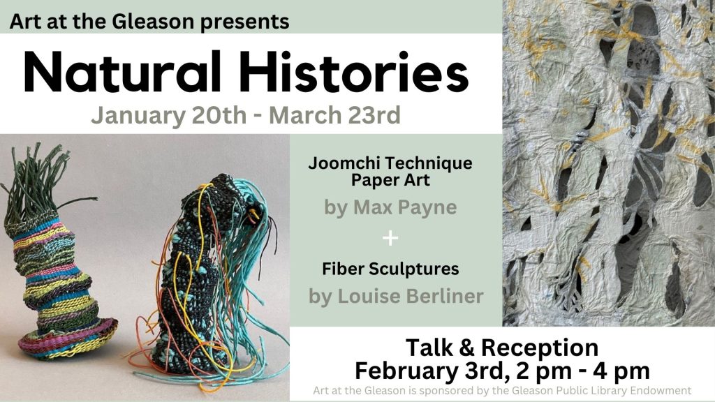 Natural Histories: Joomchi Technique Paper Art by Max Payne and Fiber Sculptures by Louise Berliner will be on display until March 23rd, 2024.