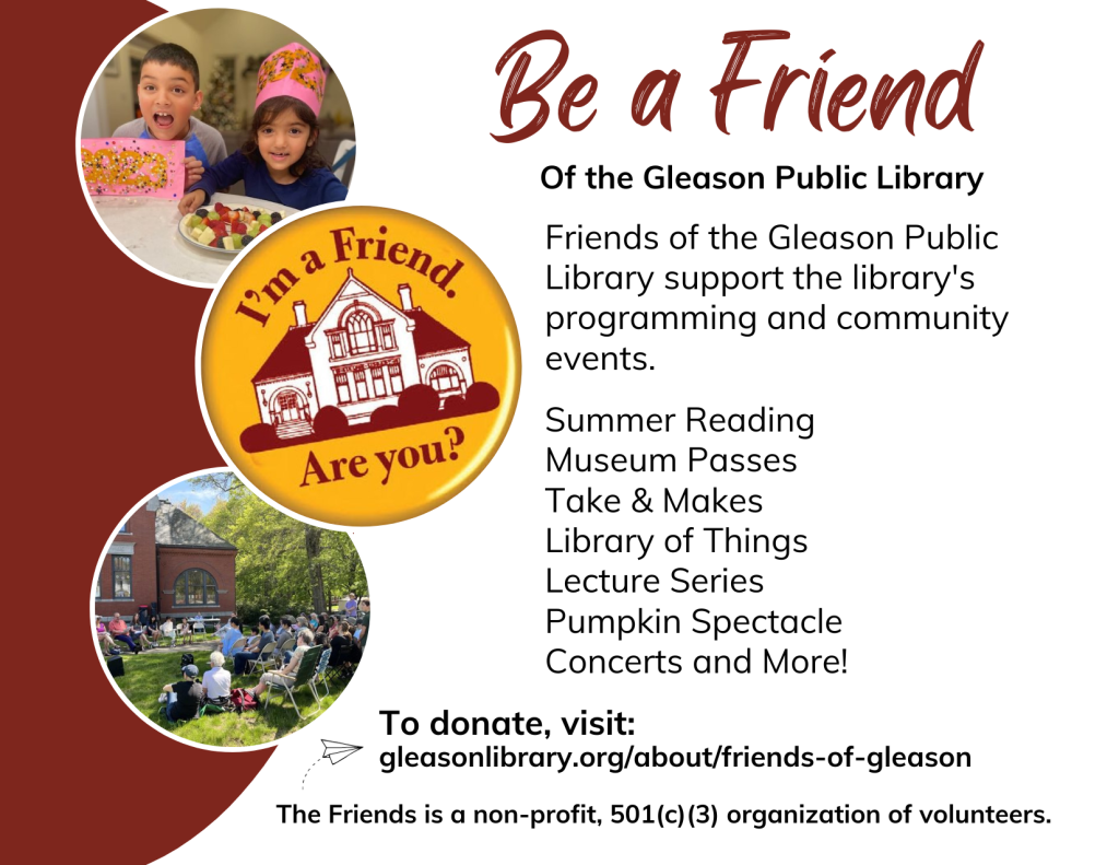 Our wonderful Friends of the Gleason Public Library have started their annual fall fundraising drive. The Friends are a 501(c)(3) nonprofit supporting the Gleason’s programming for all ages, museum passes, take-home kits, Library of Things items, and other special materials. Their Annual Appeal is key to providing this support. Please join the Friends today to be part of a wonderful community organization!