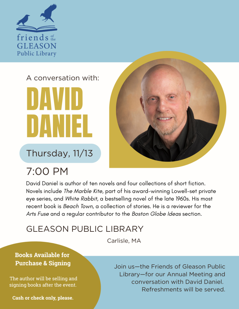 Join the Friends of the Gleason Library Annual Meeting on Thursday, November 13th, at 7 p.m., featuring local author David Daniel! Following a short business meeting, David Daniel will speak and answer questions.