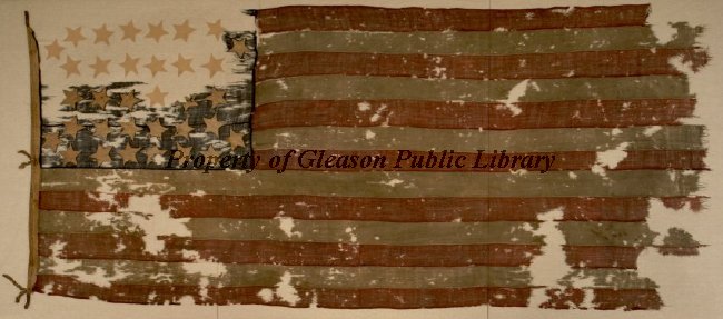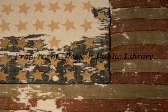 A Union Civil War era flag with thirty four stars. Fourteen of the stars are not original, but put in place by the conservator to give an idea of what the whole flag looked like. Approximately half of the canton is missing, and there are many holes in the whole flag.