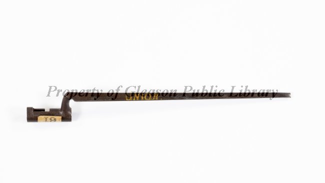The bayonet's blade tip is broken off. One side of the blade has "Union" painted in yellow. A black printed number "61" on a white label is affixed to the bridge