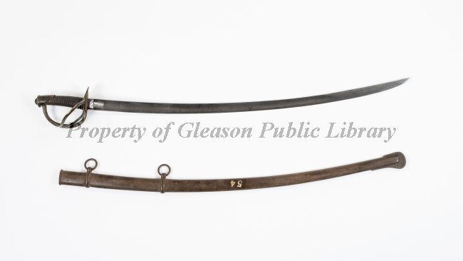 A cavalry saber. The curved blade is steel, and with a "C" engraved near the hand guard. The hand guard is brass. The grip is a leather surface over metal.