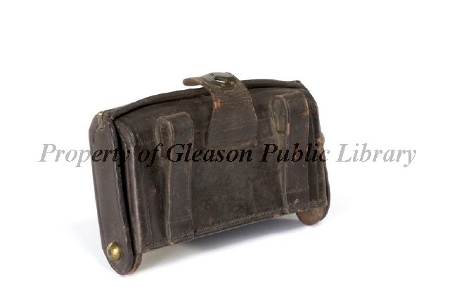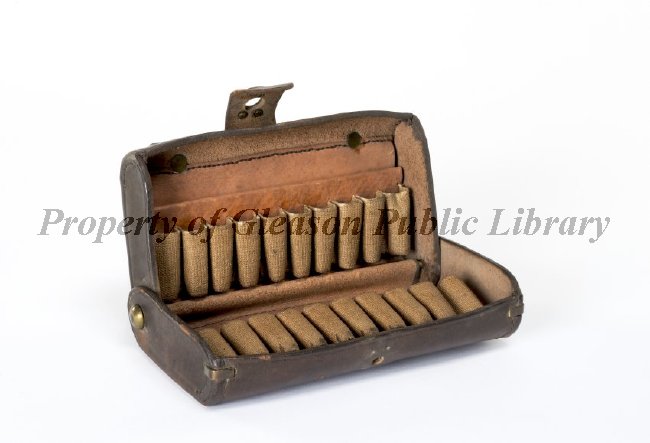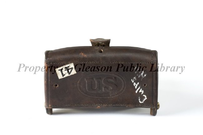 There are ten fabric cartridge holders in the interior. "US" is imprinted in an oval on the front of the case. A white label with the black number "41" is affixed to the front. White paint on the front reads "Culp's Hill", although Heald's inventory labels it as being from Peach Orchard. The imprint on the strap reads "WATERVLIET ARSENAL", and the inside of the bag has the imprint "A.R. SMITH".