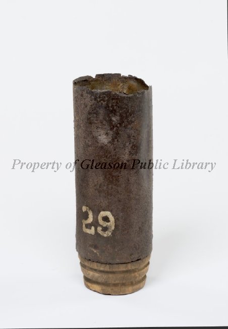 The canister is made of one sheet of metal, with one seam stretching the length of it. Four nails fasten the canister to its wooden base.
