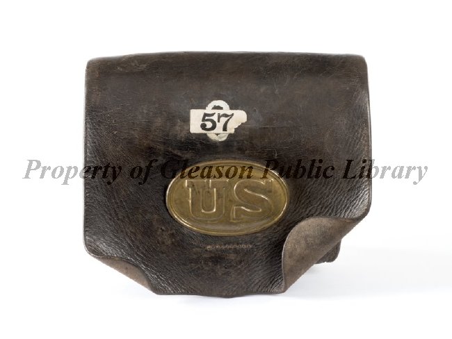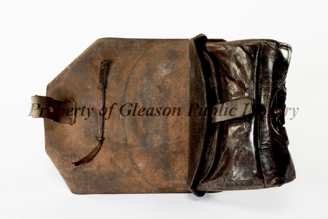 The leather bag has a copper alloy (brass?) "US" oval insignia attached to the lower front flap. The flap has a white label with a black printed number "57" which is covering white paint (presumably of a number). The bag would have had two straps attached in the back with buckles for strapping. These have been cut level with the upper height of the bag.