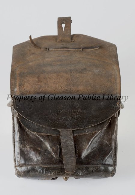 The piece is impressed underneath the top flap with an oval manufacturer's stamp that consists of an outer oval rim and an inner field. The rim bears the manufacturer's information: on the top line, "READ (?)& Sons", and on the bottom line, "BOSTON". Within the inner field, "MANUFACTURERS OF ARMY ACCOUTREMENTS".